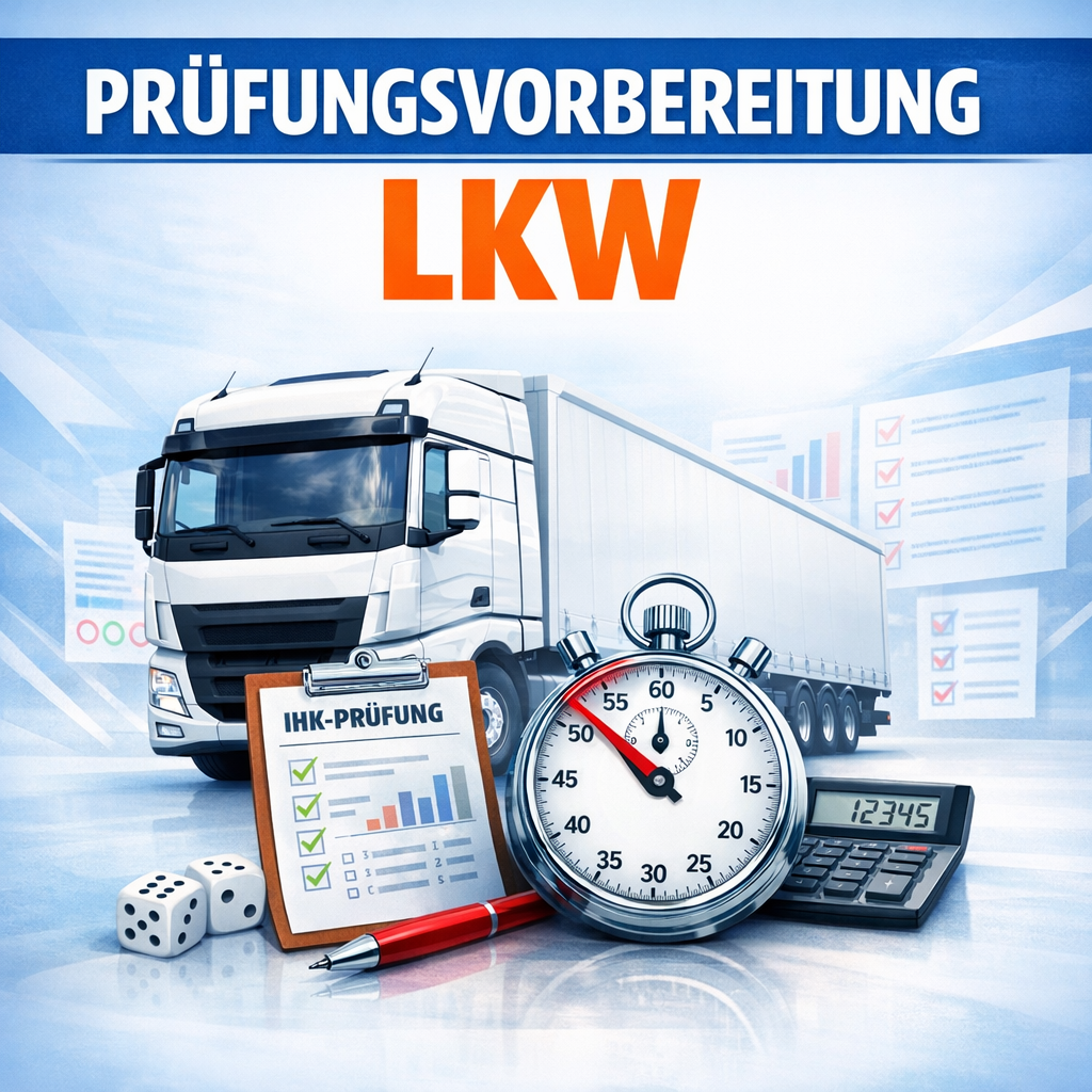 Training mit echten IHK‑LKW‑Prüfungsaufgaben Fallstudien, Rechenaufgaben (Kosten, Maut, Kalkulation), Multiple‑Choice.